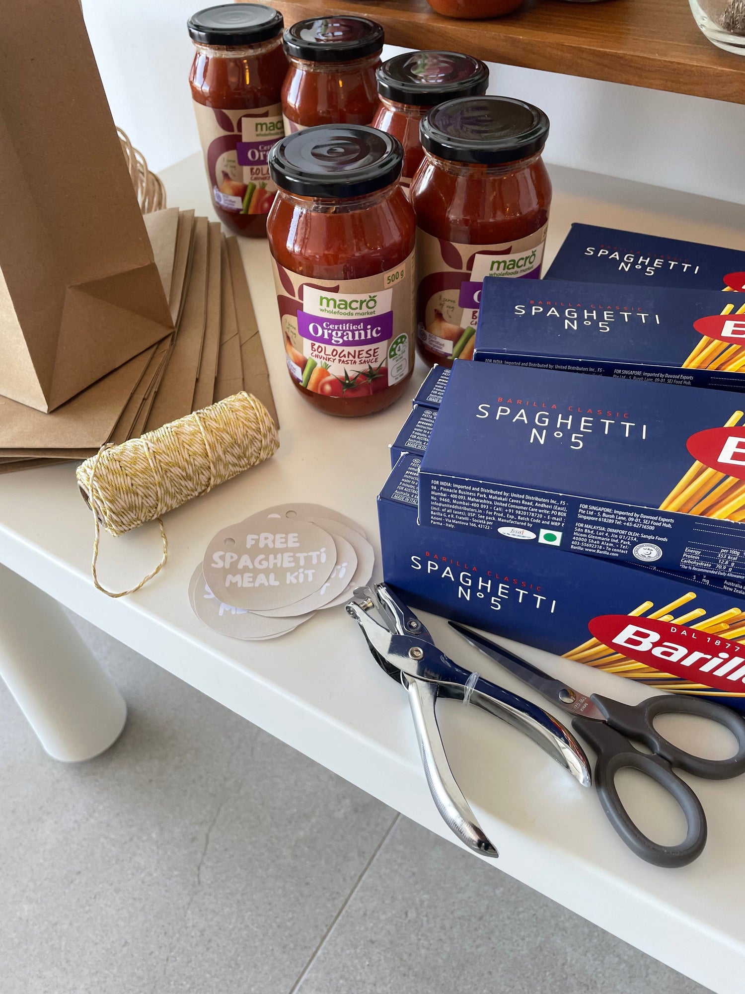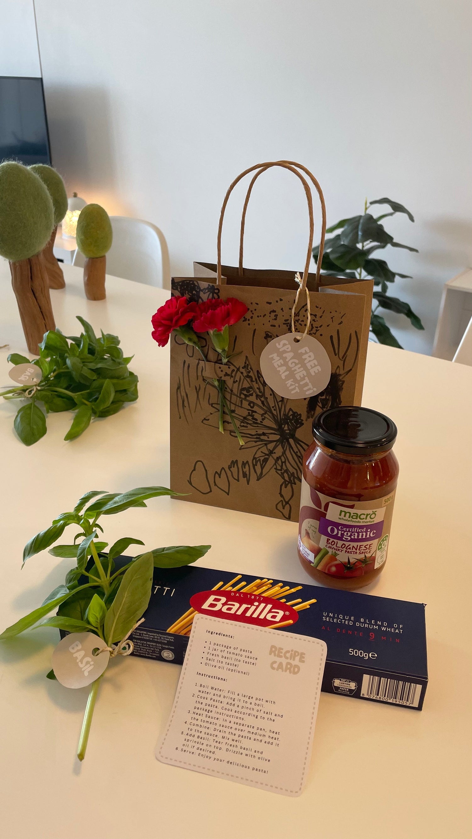 Faça dez kits de refeição contendo macarrão, molho de tomate e manjericão!